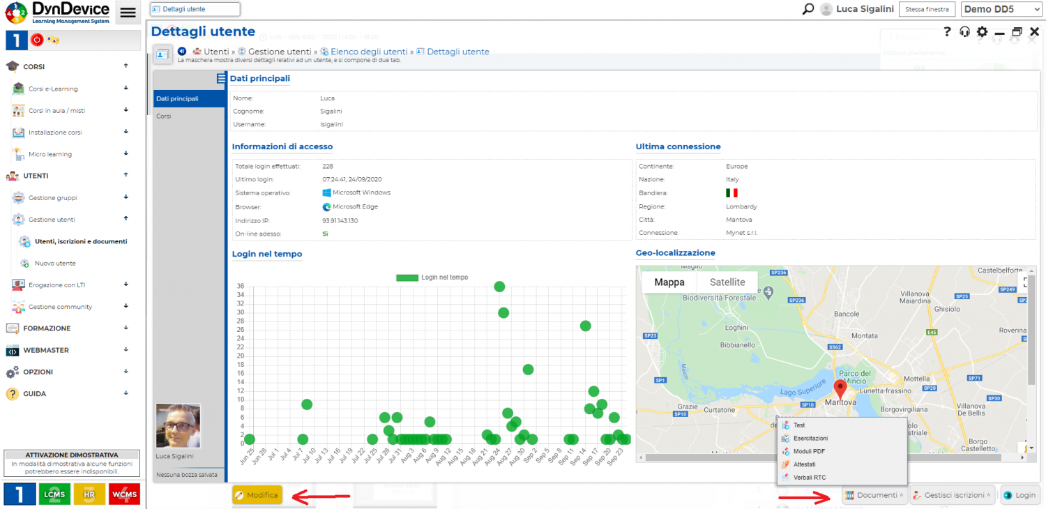 La maschera "Dettagli utente" che espone i dati dei learner è stata decisamente migliorata. Un nuovo tab ora viene mostrato all'apertura della medesima, dove vengono mostrati tutti i dati anagrafici, un grafico con lo storico delle connessioni, e la mappa da dove è stato effettuato l'ultimo collegamento.