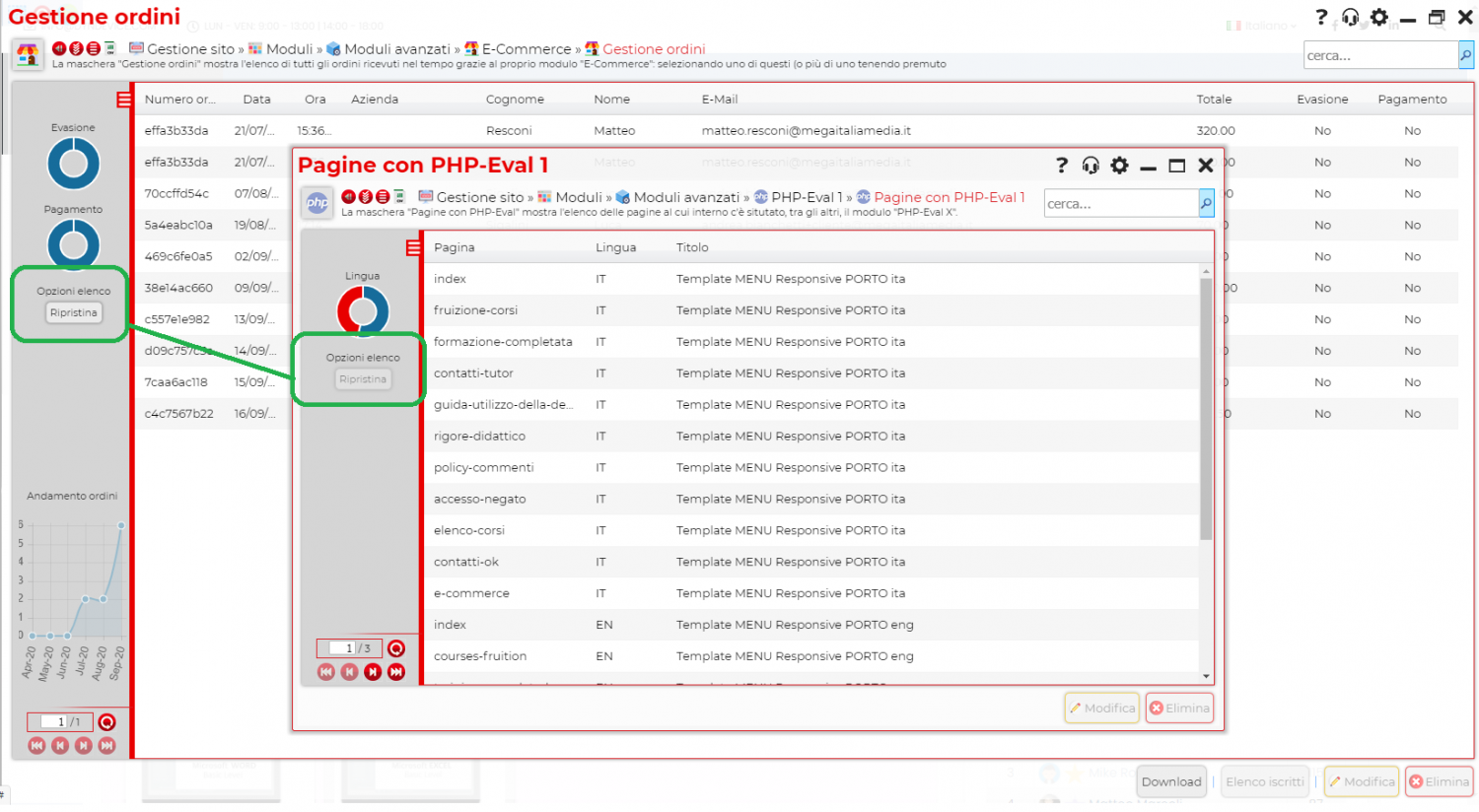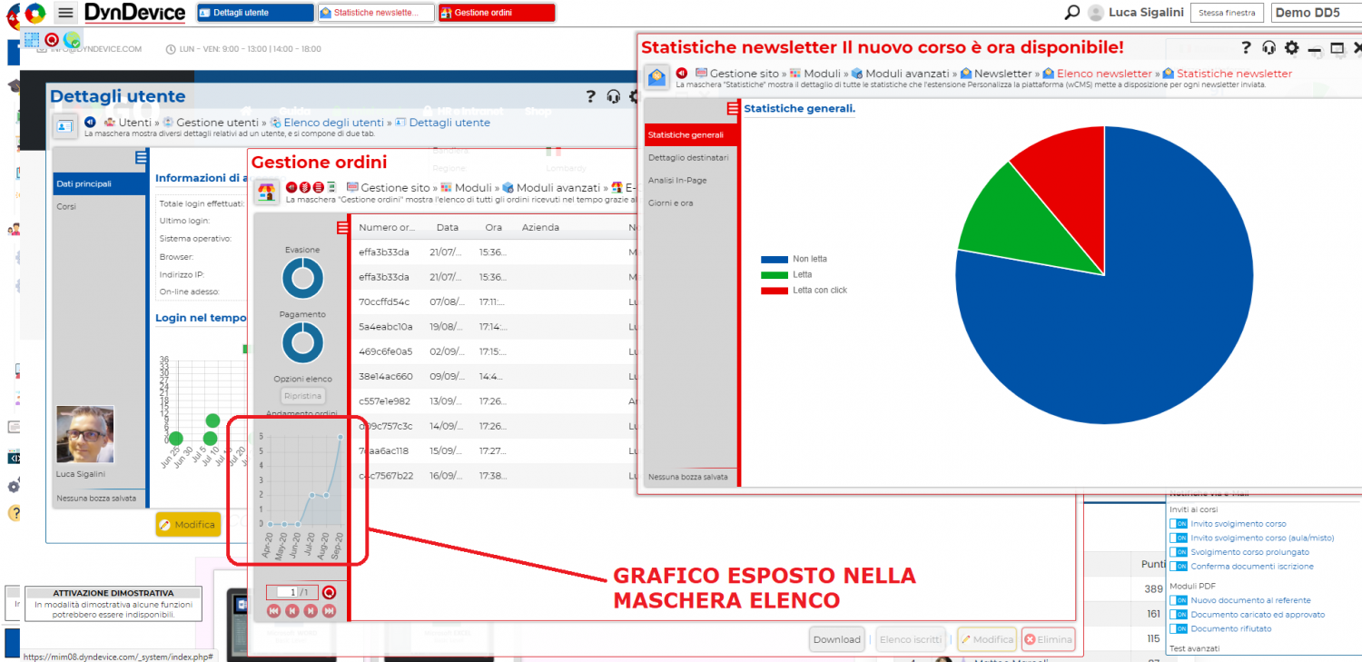 I grafici di sistema sono ora tutti generati con HTML 5 anziché in Adobe Flash, e risultano quindi anche stampabili (utile p.e. nei dettagli di un "Test avanzato" o "Questionario di gradimento") nonché visualizzabili anche da dispositivo mobile. Le maschere inoltre, possono essere inoltre dotate di grafici esplicativi dell'elenco che si sta mostrando (nell'immagine seguente mostrato, tra gli altri, la maschera "Elenco degli ordini").
