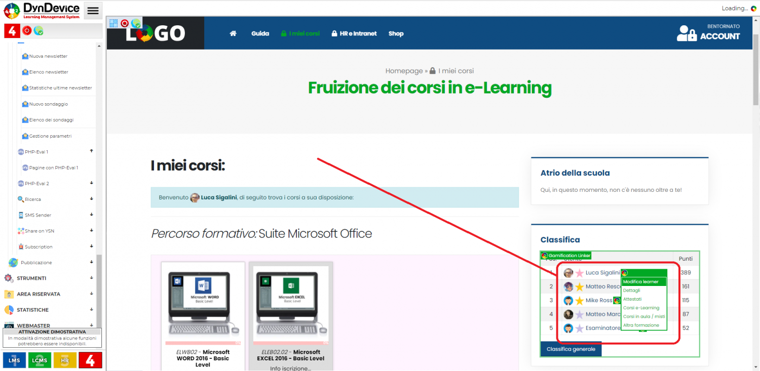 Quando ci si logga al pannello di controllo sfruttando l'opzione "Login 1 to 1" con il tipico link "Gestisci questa piattaforma", la piattaforma e-Learning/sito di provenienza viene mantenuta come sfondo del pannello di controllo di DynDevice LMS. Nella piattaforma e-Learning quindi, in questa modalità "fusion front-back-end", i vari oggetti diventano "interagibili" e possono esporre un menù contestuale con cui richiamare le funzionalità del pannello di controllo.