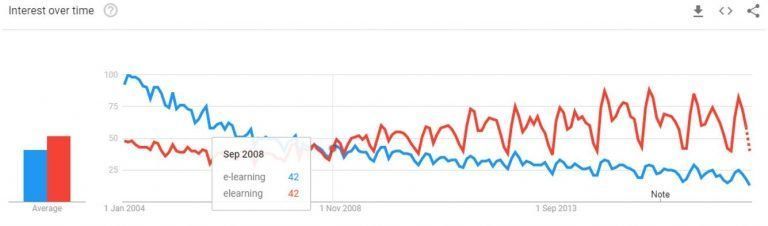 Tuttavia, Google Trends racconta un'altra storia. I dati indicano il primato della forma "e-Learning" nei primi anni 2000, poi superata in popolarità nei motori di ricerca dalla forma "eLearning" a partire dal 2008. Insomma, oggi le persone digitano "eLearning" per fare le loro ricerche sul web. Nel prossimo futuro il trattino in "e-Learning" andrà a scomparire? E' possibile: spesso le parole con trattino nascono come neologismi, ma non appena diventano di uso comune il trattino viene abbandonato. Pensiamo alle "e-mail", agli "e-book" ai "web-site": l'uso comune ha fatto perdere loro l'accezione di parole composte e sono state concepite come unità a sé stanti, abbandonando il trattino (Greenfield, 2012).