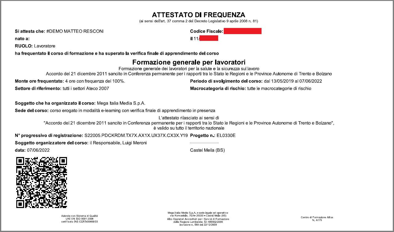 Di fatto quindi, il QR-Code è una marca che autentica la validità dell'attestato, in quanto associa il documento PDF, PDF/a o stampato fisicamente, a dei dati esposti on-line. Che corrispondendo a quelli contenuti nell'attestato, ne testimoniano l'autenticità; non è infatti possibile utilizzare lo stesso QR-Code per più attestati, o manometterne i dati anagrafici sul PDF (poiché i dati manomessi non avrebbero riscontro con quelli esposti dal sito www.courstore.it).