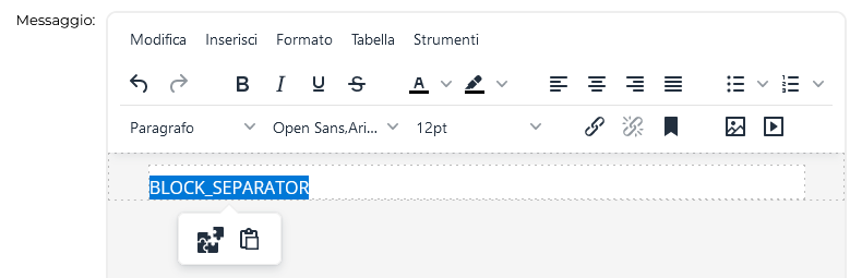 La specialità del modello “Newsletter 2022 Contenitore Blocchi” è che contiene la parola chiave BLOCK_SEPARATOR che, se selezionata, porterà a mostrare la toolbar contestuale mostrata nell'immagine qui a fianco.