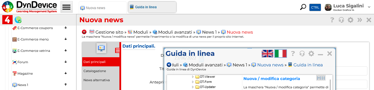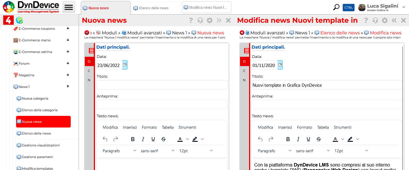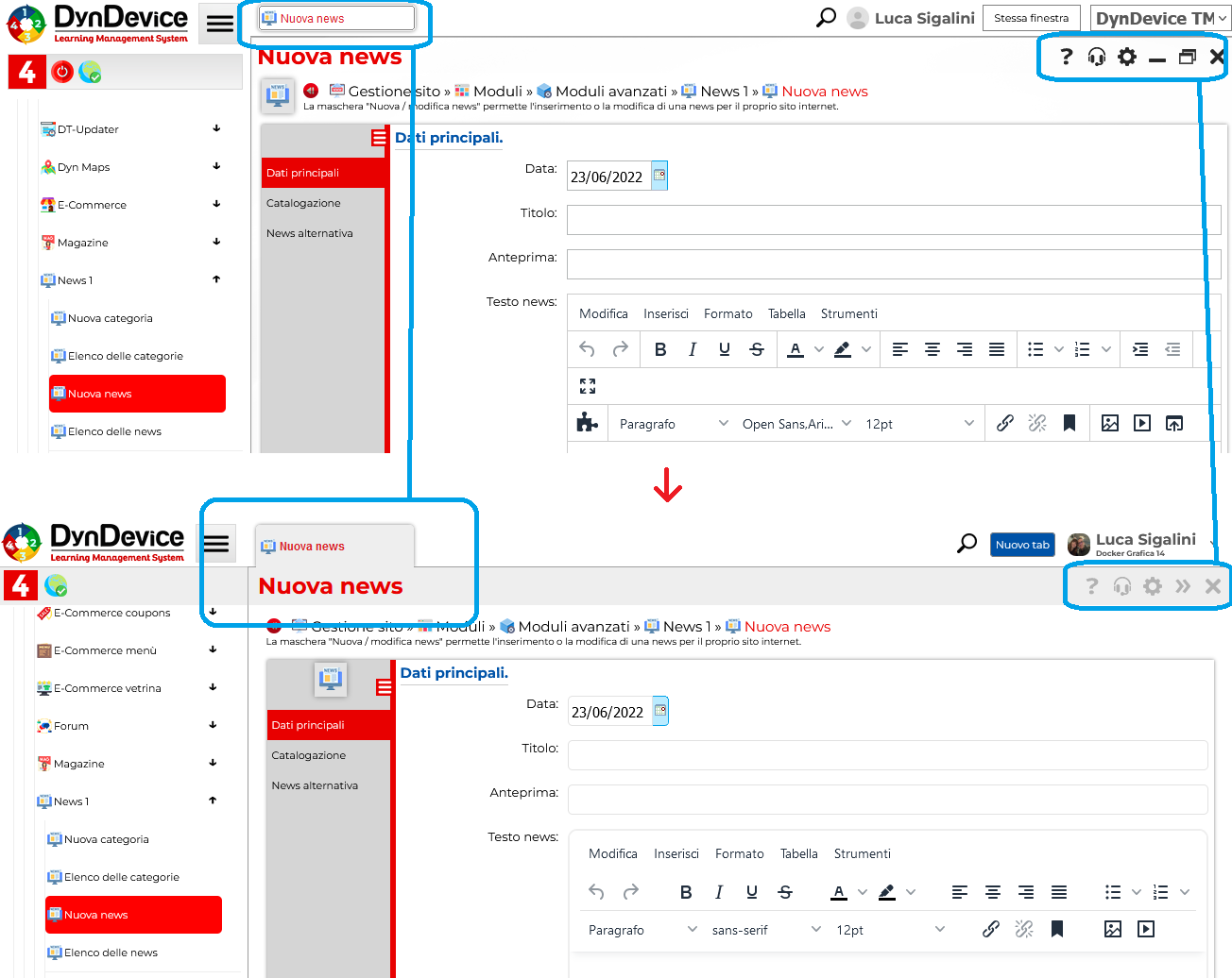 I tab non spostati a destra (nell'immagine "Nuova news" o "Elenco delle news") saranno quindi visibili a sinistra in modo mutuamente esclusivo, mentre il tab "Modifica news..." rimane sempre in primo piano sulla destra (e viene esposta nella barra dei tab/finestre attivi con il pulsante tipico delle finestre fluttuanti).