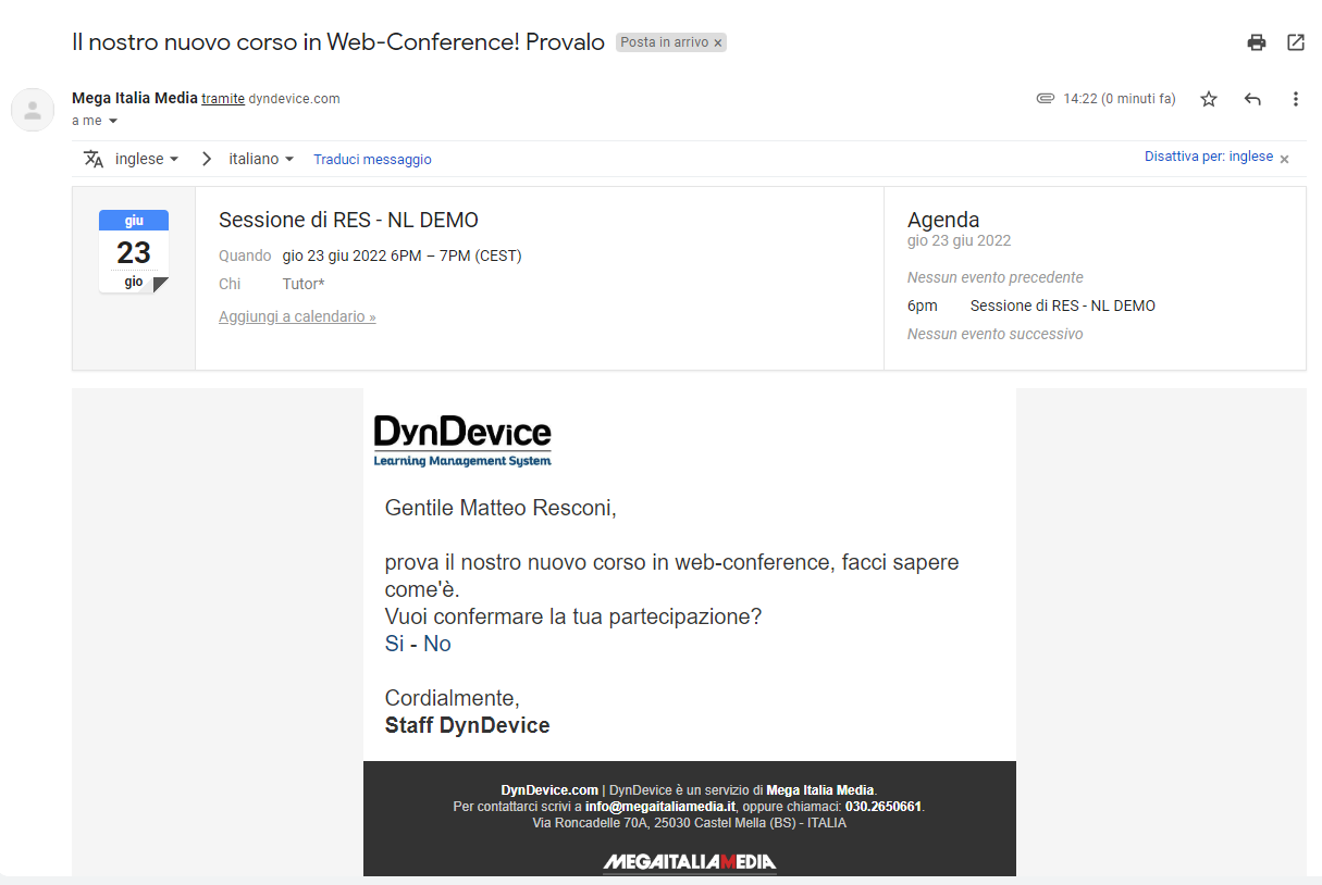 Tramite le informazioni "di calendario", l'utente può confermare la partecipazione all'evento. E aggiungerselo nel proprio calendario.