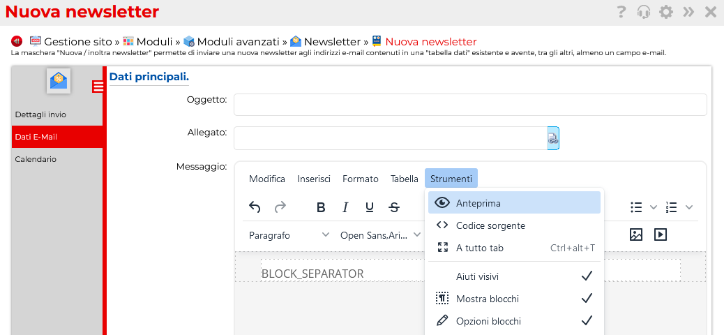 Con questa modalità di editing, sarà possibile comporre il contenuto della propria newsletter (ma in realtà di qualsiasi contenuto gestibile con l’editor visuale) a partire da un insieme di blocchi precedentemente creati, ben definiti e dalla grafica e dal codice HTML puntuale e magari precedentemente creato da un grafico.